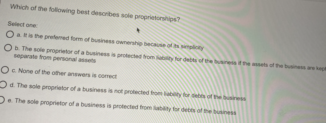 It is the preferred form of business ownership because of its simplicity O b. Which of the following describes a sole proprietorship. A business owned by an individual.